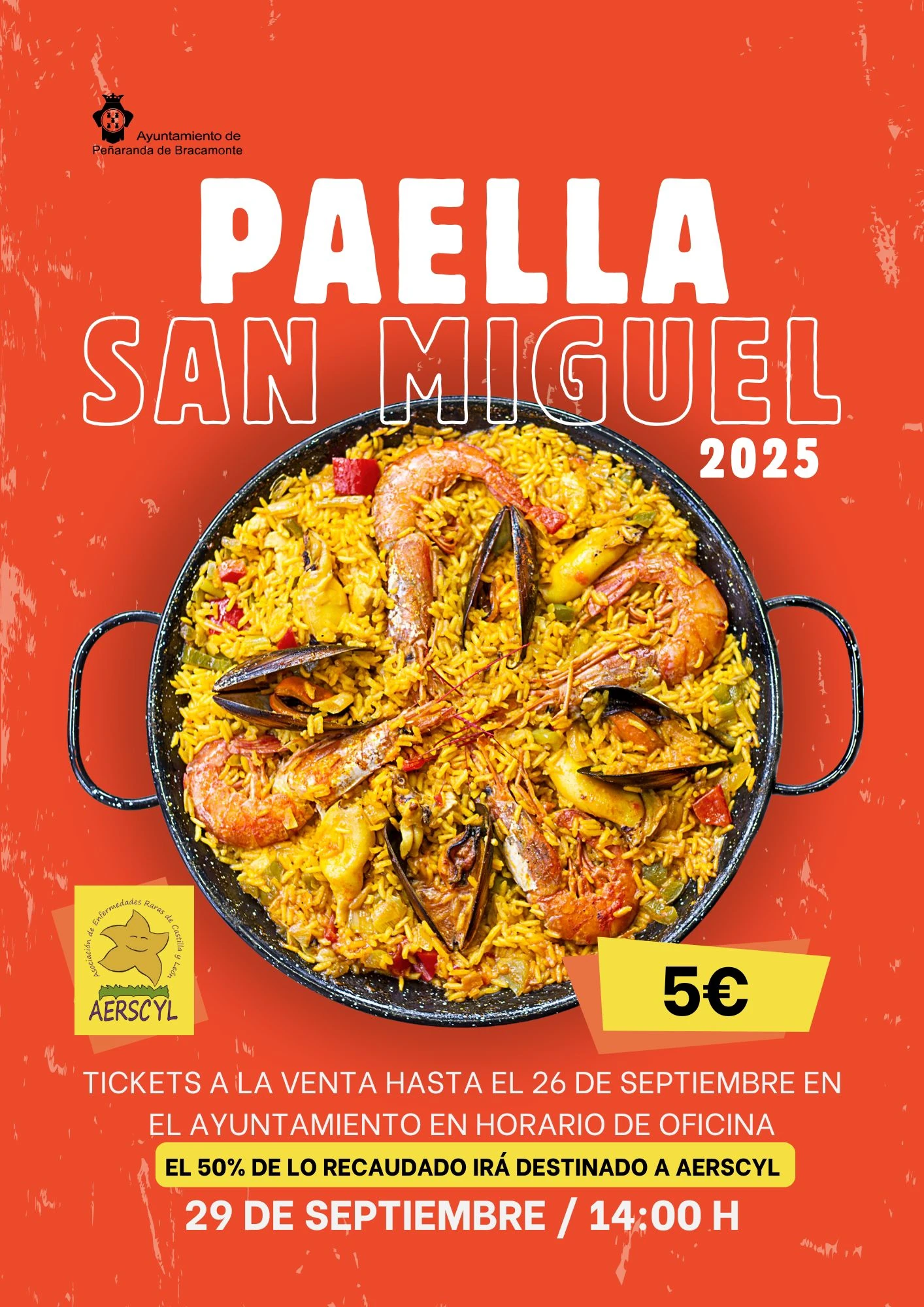 14:00 h. Paella popular a beneficio de Aerscyl (5 €, donativo de 2,5 € a Aerscyl). Los tickets se pueden adquirir en el Ayuntamiento hasta el 26 de septiembre.